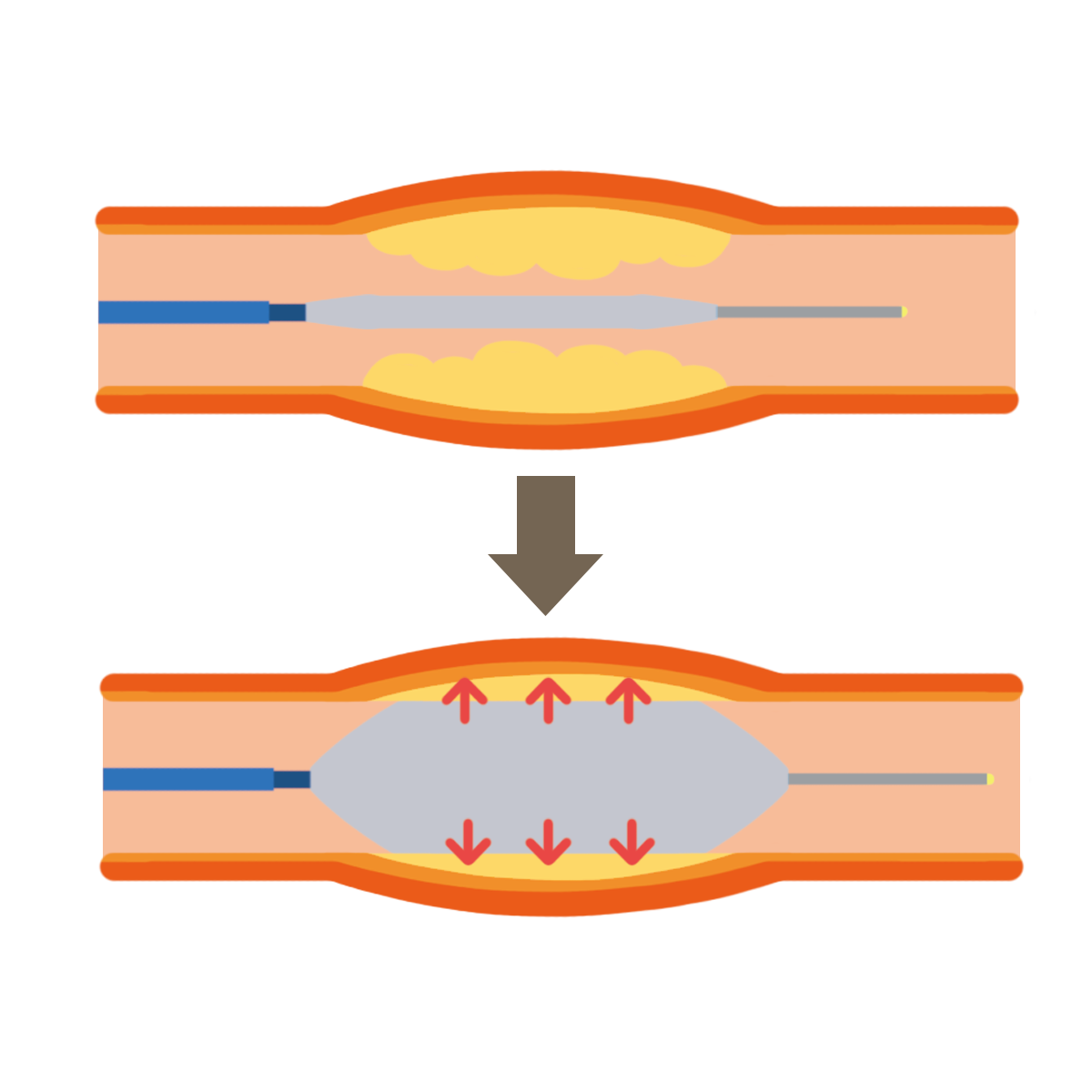 細いワイヤーとバルーンを血管内に挿入し、バルーンを拡張することで、血管の通りを改善します。